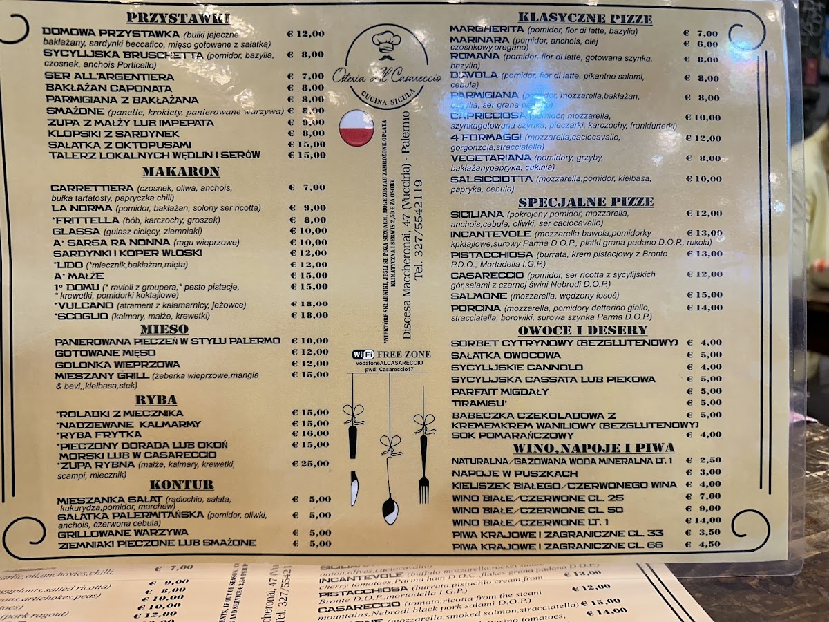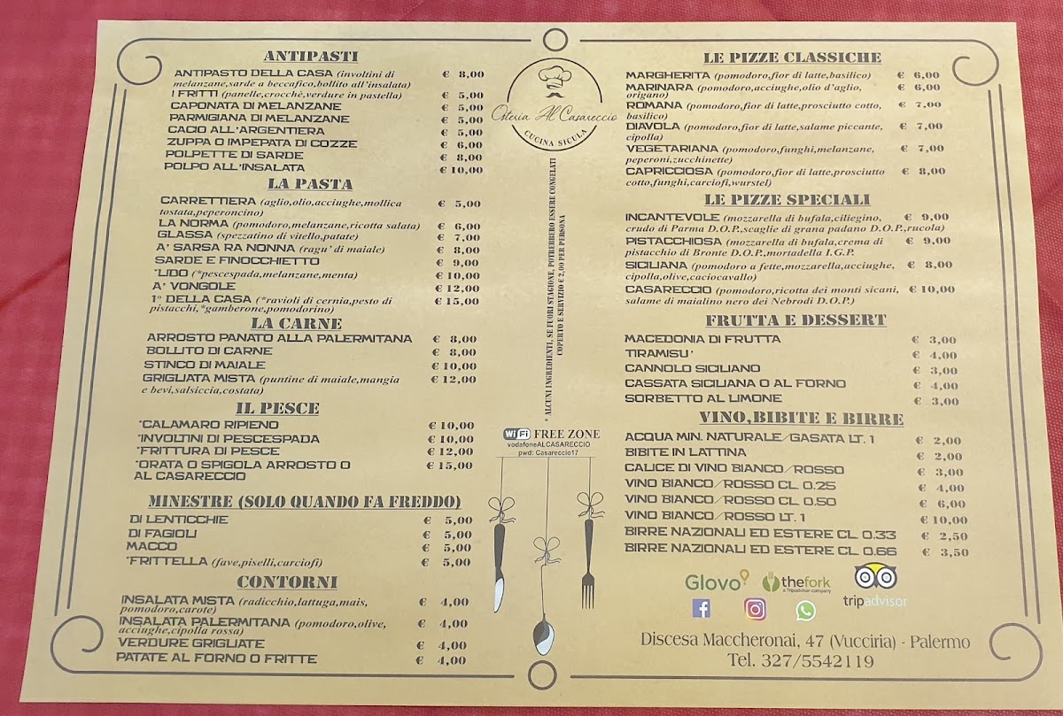 Osteria Al Casareccio offers an authentic Italian dining experience nestled in the heart of Palermo at Via Maccherronai. The menu highlights the rich flavors of Sicilian cuisine, featuring standout dishes like pasta con nero di seppia, polpetta di sarde, and the perfectly cooked cotoletta di pollo. Seafood lovers will delight in the fresh Mussels with pepper sauce and the vibrant Scoglio pasta, brimming with clams, squid, mussels, and prawns. Traditional Sicilian pizza and gnocchi round out the hearty offerings, all served in generous portions that capture Italy's passion for food.